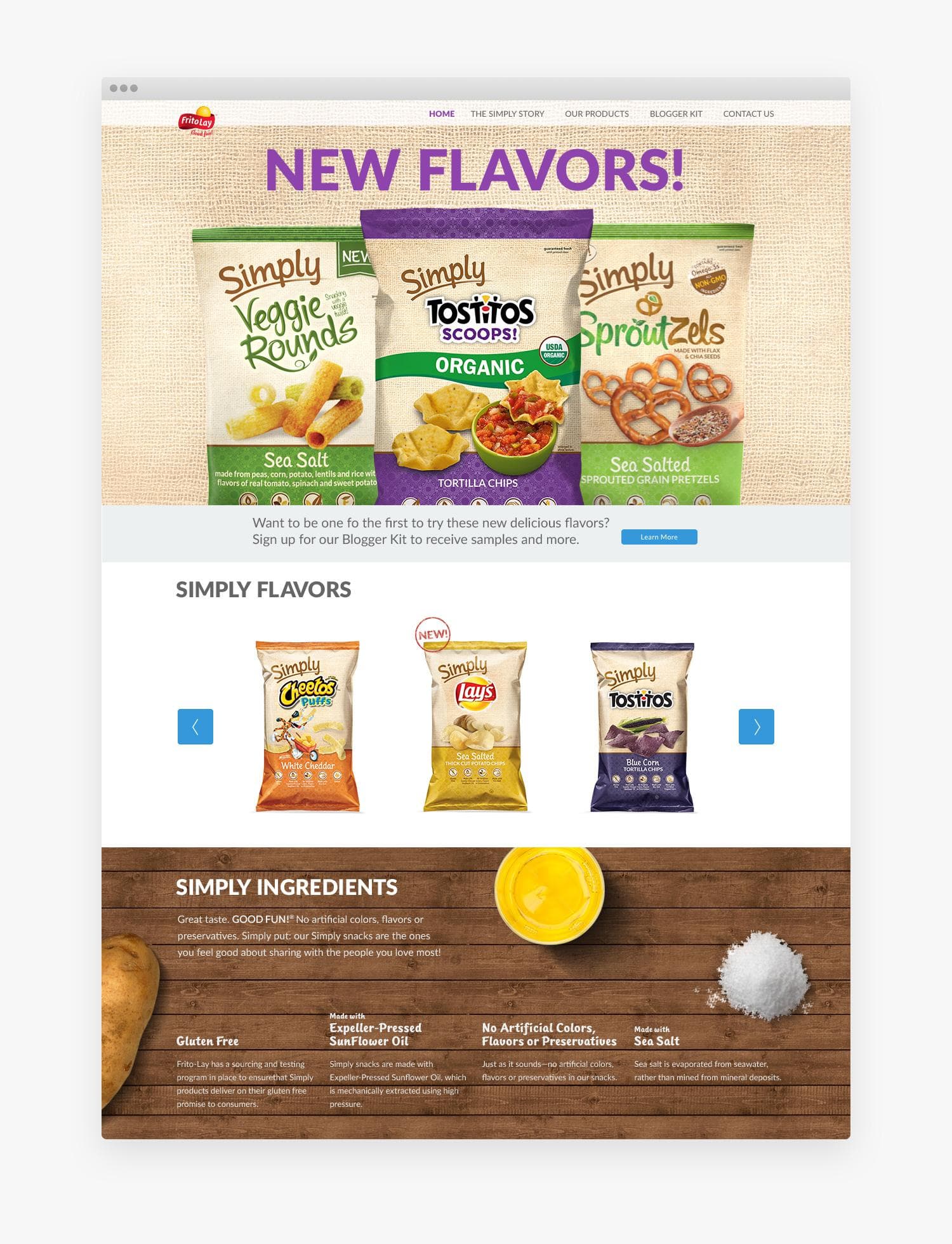 Brand and marketing pages for the newly launched Simply brand of chips and snacks. Bright, bold colors playing off natural materials like wood and burlap.